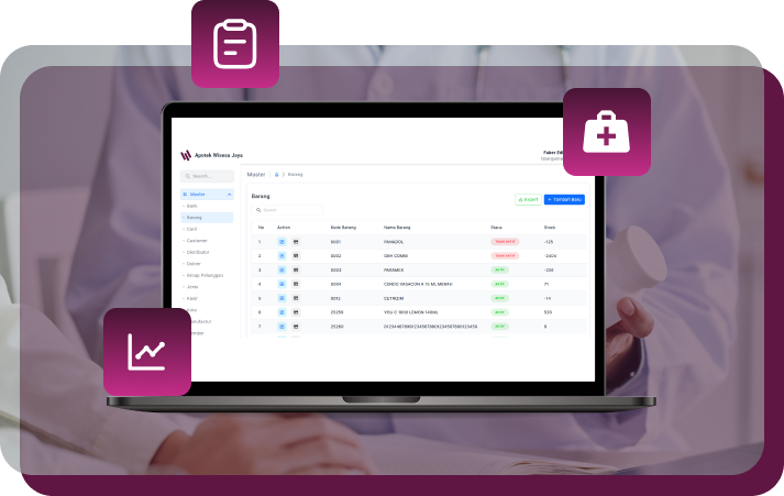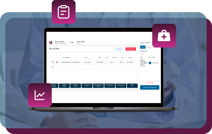 Manajemen stok obat, transaksi penjualan, dan laporan keuangan jadi lebih praktis dengan software Apotek WisePOS. Dilengkapi dengan sistem POS (Point of Sales) kasir pintar, WisePOS membantu mengoptimalkan bisnis farmasi Anda di era digital.